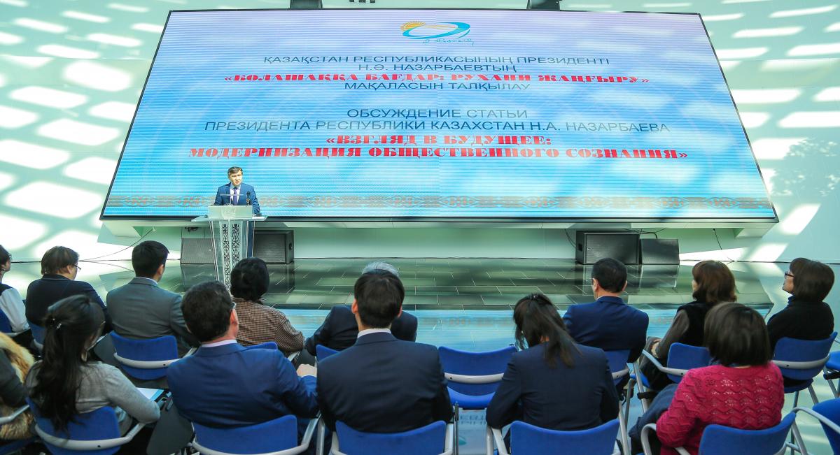Жиынды Елбасы кітапханасы директорының орынбасары Бейсембай Жұмабеков ашты. Ал, мақаладағы негізгі басымдықтар мен бағыттар туралы Әлеуметтік-ағартушылық жобалар қызметінің жетекші ғылыми қызметкері Ғазиз Телебаев әңгімеледі. «Технологиялық жаңғыруға арналған биылғы Жолдаудан және саяси жаңғыруға бағытталған конституциялық реформадан кейін маңызды қадам рухани жаңғыру қолға алынбақ. Елбасының мақаласында белгіленген мақсат-міндеттер – өте өзекті. Алмағайып әлем жылдам өзгеруде. Оған жұдырықтай жұмылған ұлт болып бейімделуіміз керек», деген Ғ.Телебаев латын әліпбиіне көшу, туған жерді көркейту, гуманитарлық білім беру, мәдениетті заманауи қалыпқа келтіру, құндылықтардың бүкіл қазақстандық шеңберін құру, абыройлы замандастарды ардақтау – барлығы нақты тапсырмалармен ұласуы қажеттігін, оны іске асыруға уақыт берілгенін айтты. Ол сондай-ақ, ұлттық кодты сақтау арқылы рухани жаңғыру қажет деген мағынадағы Елбасы идеясын басшылыққа ала отырып, бүгінгі заманда ағылшын тілін білудің қажеттілігіне тоқталды. Әсіресе, алыс-жақын шет елдермен байланыстағы кітапхана қызметкерлерінің ағылшын тілінде сөйлей алуы өзекті екенін жеткізді. Ал, Елбасының қоғамда үлкен резонанс туғызып жатқан латын әліпбиіне көшу туралы пікірі «көшеміз, көшпейміз» деп талқыланатын емес, орындалуы тиіс шаруа екеніне маңыз берді.