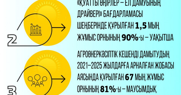 Іс жүзінде аңғарылғаны – бағдарламалар тұрақты, пайдалы жұмыс орындарын құру үдесінен әрдайым шыға бермейді. 2008 жылдан бері 5 жұмыспен қамту бағдарламасы қабылданса да, ел елеулі нәтижелерді әлі күтіп жүр. Жоғары аудиторлық палатаның жұмыспен қамтудың мемлекеттік бағдарламасы аудитінің қорытындысы жұмыс орындарының көбі уақытша екенін көрсетті. Мысалы, «Қуатты өңірлер – ел дамуының драйвері» бағдарламасы шеңберінде құрылған 1,5 мың жұмыс орнының 90%-ы – уақытша, Агроөнеркәсіптік кешенді дамытудың 2021–2025 жылдарға арналған жобасы аясында құрылған 67 мың жұмыс орнының 81%-ы – маусымдық. Жалпы алғанда, жаңа жұмыс орындарының 87%-ы негізінен төмен өнімді, ортамерзімді секторларда құрылған.