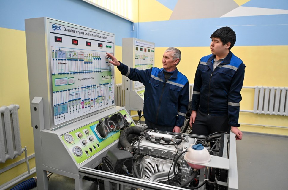 Құрылысқа, ауыл шаруашылығына, жол жөндеуге, қала тазалағанға таптырмайтын көліктерді басқарып, қызмет көрсетуге үйрететін мамандықпен танысқан соң, есігі айқара ашық тұрған кабинетке бас сұқтық. Мұнда автомобиль көлігіне техникалық қызмет көрсету, жөндеу және пайдалану мамандығында автокөлік электр жабдықтарын жөндеуші электрик, техник-механик бағытын игеретін студенттер тәжірибе сабақтарын өтеді. Колледждің техникалық жабдықтарын таныстырып жүрген өндірістік оқыту шебері Олжас Оспанов осы пәндерден сабақ береді. Мұнда жеңіл көліктің барлық бөлшегі бар. «Volkswagen Passat B6» моделінің толық электрикасы жасалған. Оның қасында инжекторлы қозғалтқыш жүйесі, одан басқа да небір ұсақ-түйек тұр. Оқу орнының өндірістік сабаққа таптырмайтын техникалық жабдықтары осы кабинетпен шектелсе керек деп топшылап тұр едік, Олжас тағы бір кең шеберханаға бастады.