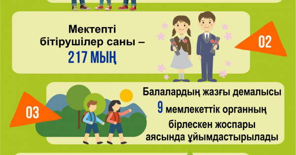 Балалардың жазғы демалысы 9 мемлекеттік органның бірлескен жоспары аясында ұйымдастырылып жатыр. Осы мақсатта республикалық және өңірлік штабтар құрылды. Каникул кезінде балалардың сауықтыру демалысын, бос уақыты мен еңбекпен қамтылуын ұйымдастыруға бірыңғай әдістемелік әзірленді. Өңірлермен бірге барлық демалыс орталығының тізімі жасалып, дайындығы республикалық штаб отырыстарында қаралды.
