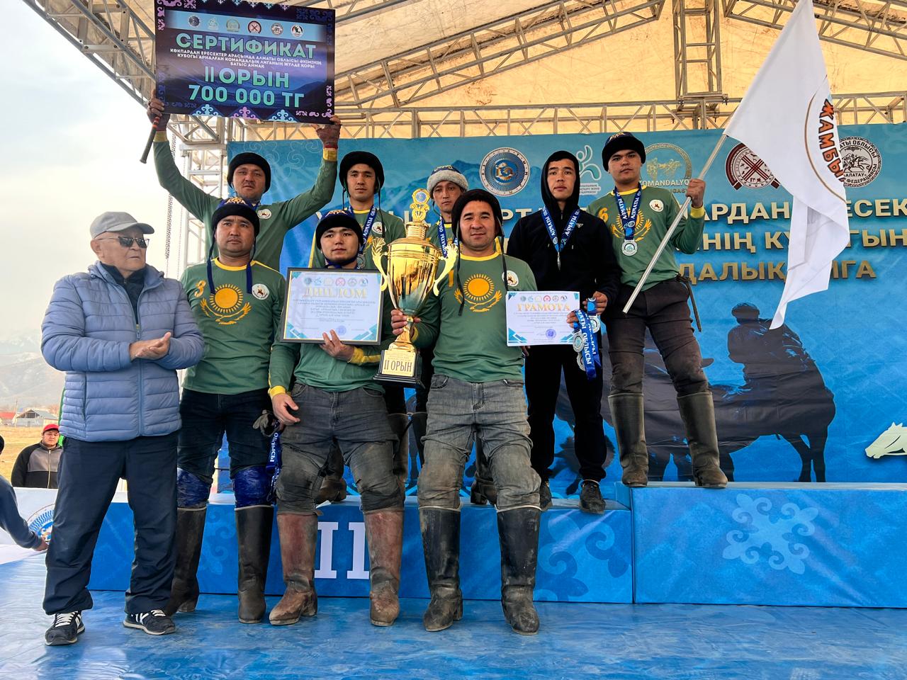 Байрақты бәсекеде Қарасай ауданының командасы жеңіске жетті. Финалдық сайыста олар Жамбыл ауданының көкпаршыларынан басым түсті. Ал турнирдің қола жүлдесі «Кемертоған» командасына бұйырды.