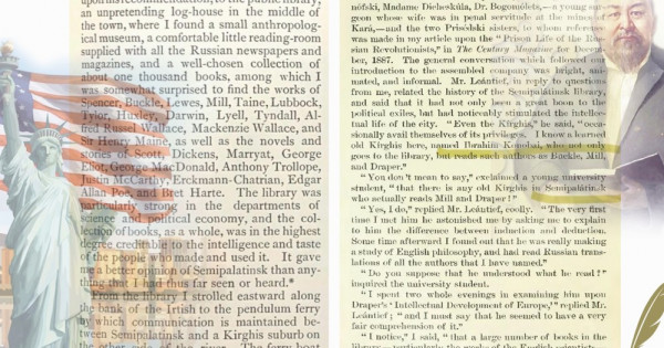 – Тіпті қырғыздар да, – деді ол, – кейде оның мүмкіндіктерін пайдаланады. Мен бұл жақта бір оқымысты қарт қырғызды білемін. Аты – Ибраһим Құнанбай. Ол кітапханаға барып қана қоймай, Бокль, Милль, Дрэпер секілді авторларды да оқиды.