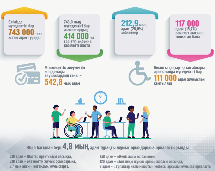 Бүгінде елімізде мүгедектігі бар 743 мыңнан астам адам тұрады. Оларды әлеуметтік тұрғыдан қолдау, өмір сүру сапасын арттыру – мемлекеттік саясаттың негізгі бағыттарының бірі.